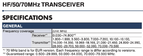 My HF radio, Icom IC-7300 (EU version) can, according to the product brochure, receive continuously from 0.030–74.800 MHz, but when you get it from factory, it can transmit only on HAM bands listen in table below.